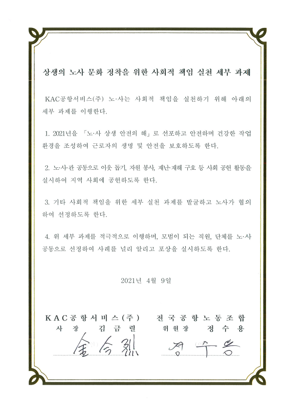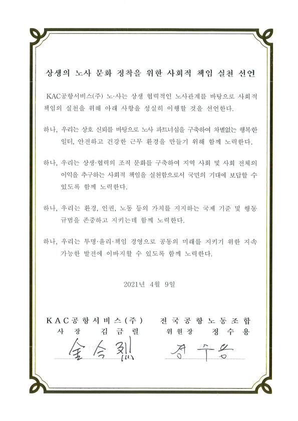 KAC공항서비스 노사는 선언문에서 "상생·협력의 조직 문화를 구축하여 지역사회 및 사회 전체에 이익을 추구하는 사회적 책임을 실천함으로써 국민의 기대에 보답할 수 있도록 함께 노력하겠다"고 의견을 모았다.