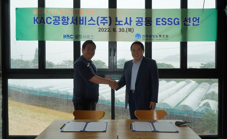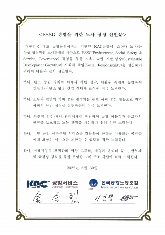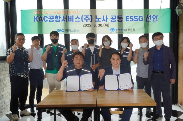 KAC공항서비스 노사가 ESSG 경영을 위한 노사 상생 선언을 실시했다.