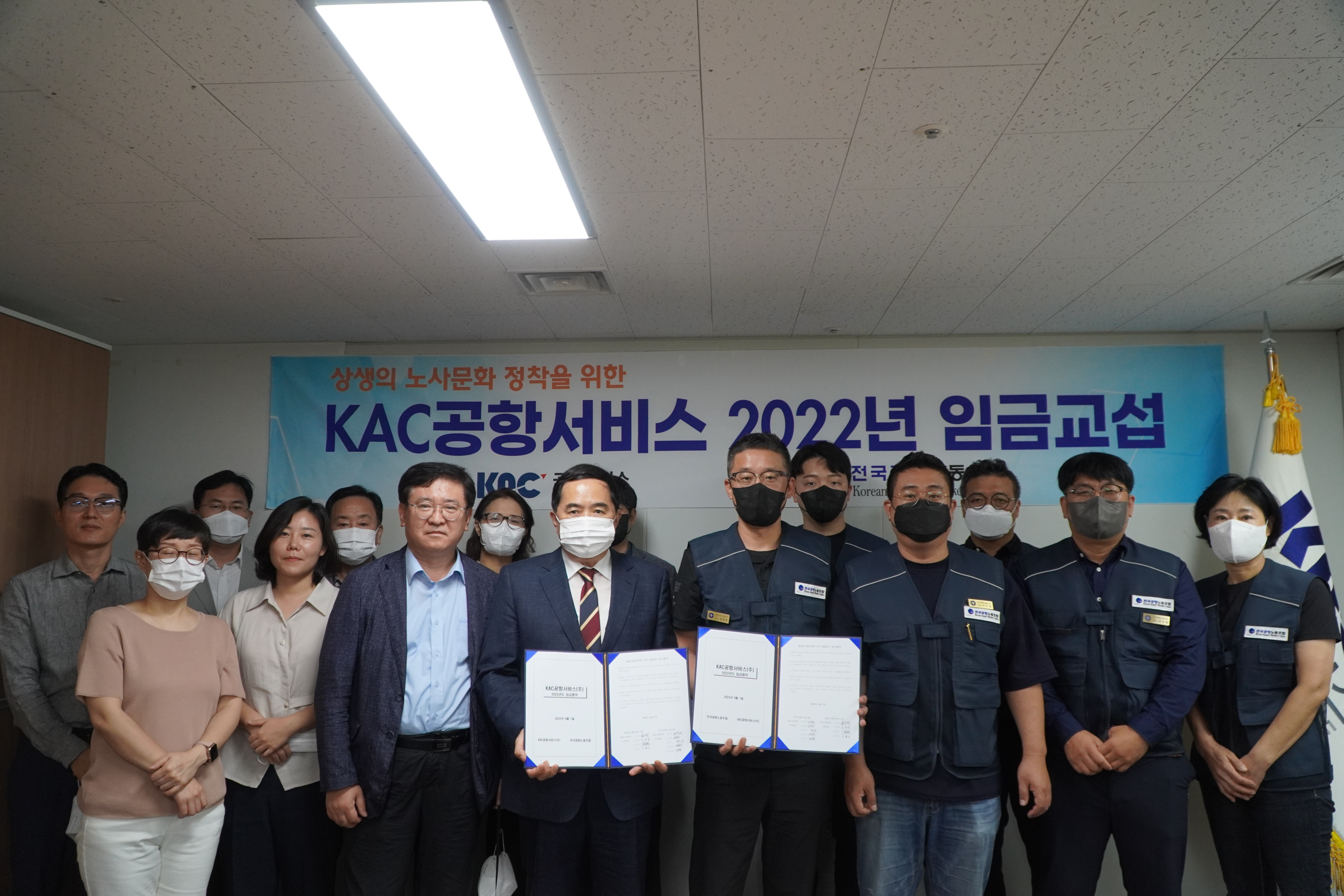 KAC공항서비스 김금렬 사장과 전국공항노동조합 엄흥택 위원장 등 노사 간부들은 2022년 9월 7일 오전 서울 강서구 회사 대회의실에서 2022년 임금협약을 체결했다. 노사는 직원들의 임금복지 향상과 회사 발전을 위해 올해 5월부터 9월까지 13차례 교섭을 진행했다.