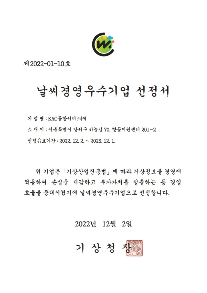 KAC공항서비스(사장 김금렬)는 지난해 12월 2일 기상청과 한국기상산업기술원이 인증하는 '날씨경영 우수기업'에 선정되었다.