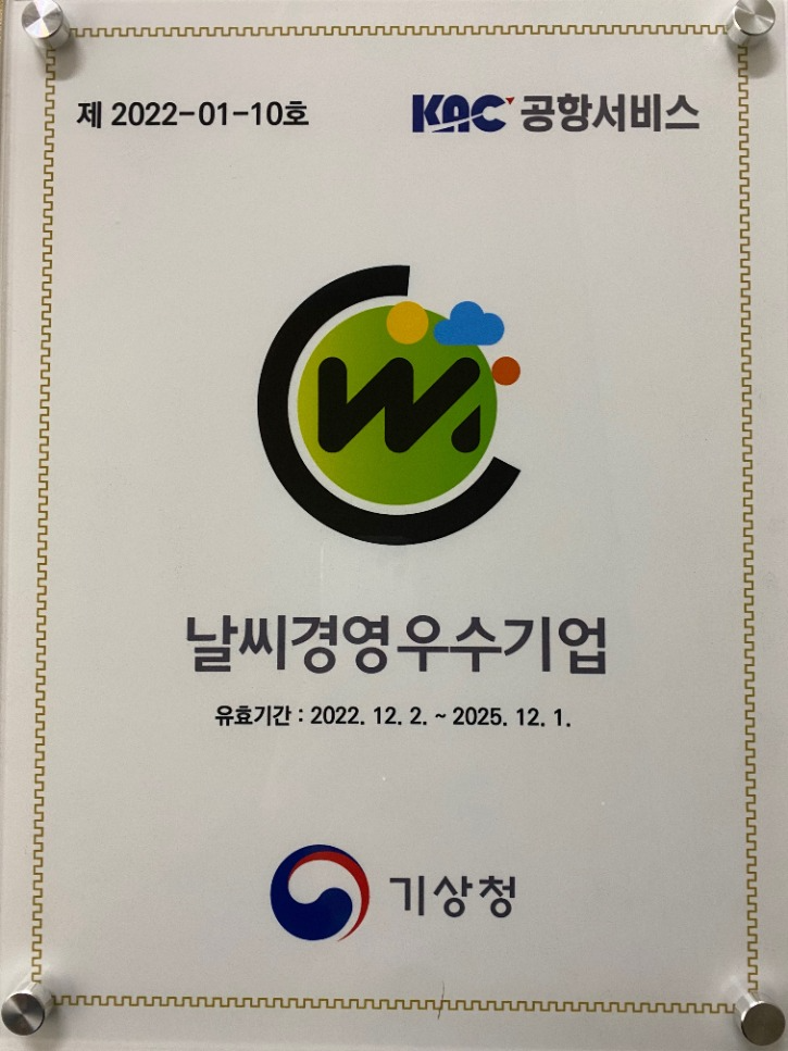회사는 '최고의 안전과 최대의 서비스' 제공을 위해, 여름철 폭염 및 풍수해와 겨울철 한파, 폭설, 결빙 등 계절적 환경변화로 인해 항공 교통사고를 포함한 안전사고 발생 가능성에 대비하여 공항 시설의 안전 저해요소를 사전에 발굴하고 제거하는 등 기상정보를 경영 활동에 적극 활용하여 날씨경영 우수기관에 선정됐다.