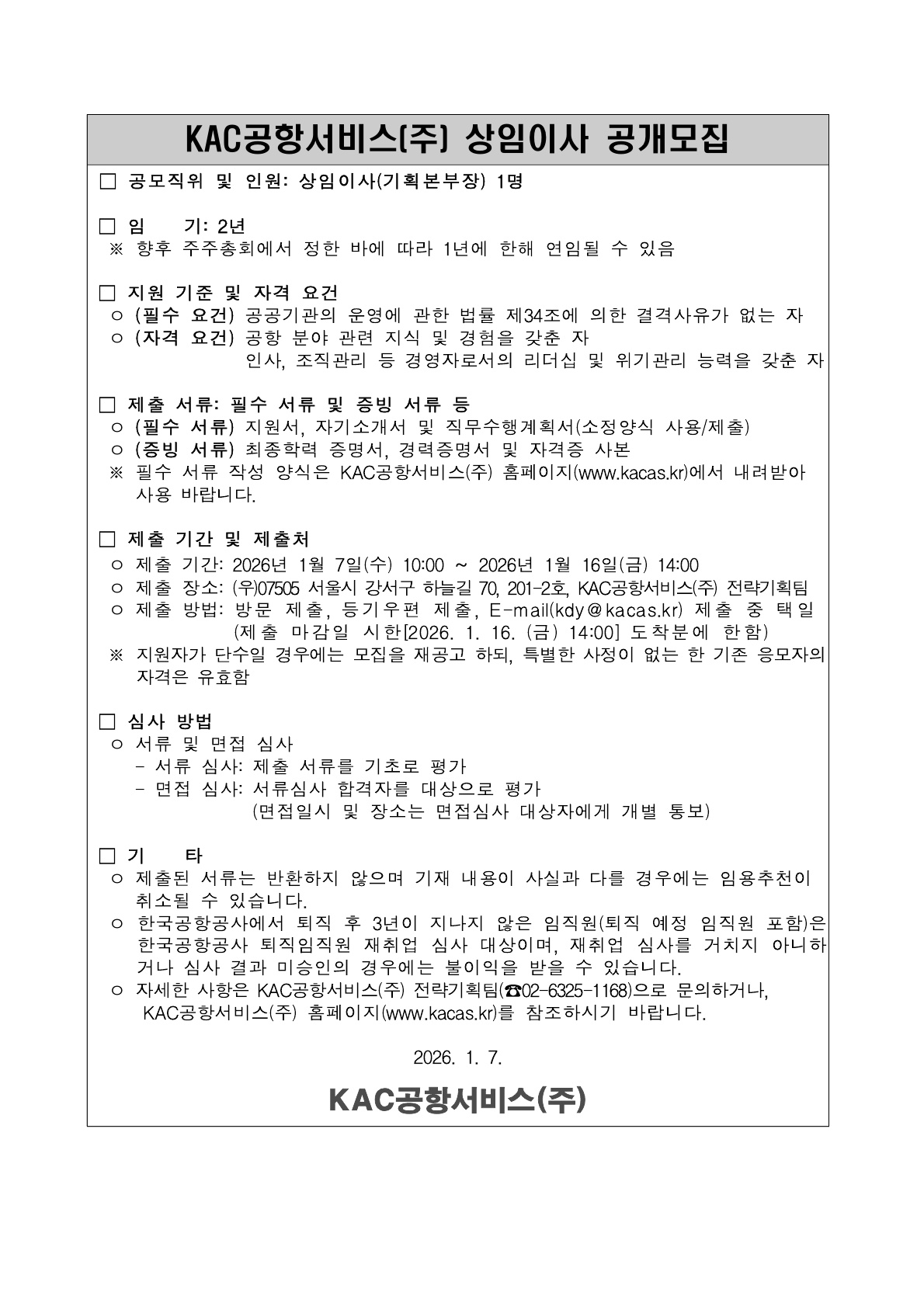 (붙임 1) KAC공항서비스(주) 상임이사(기획본부장) 공개모집_공고문.pdf (100.1 KB)