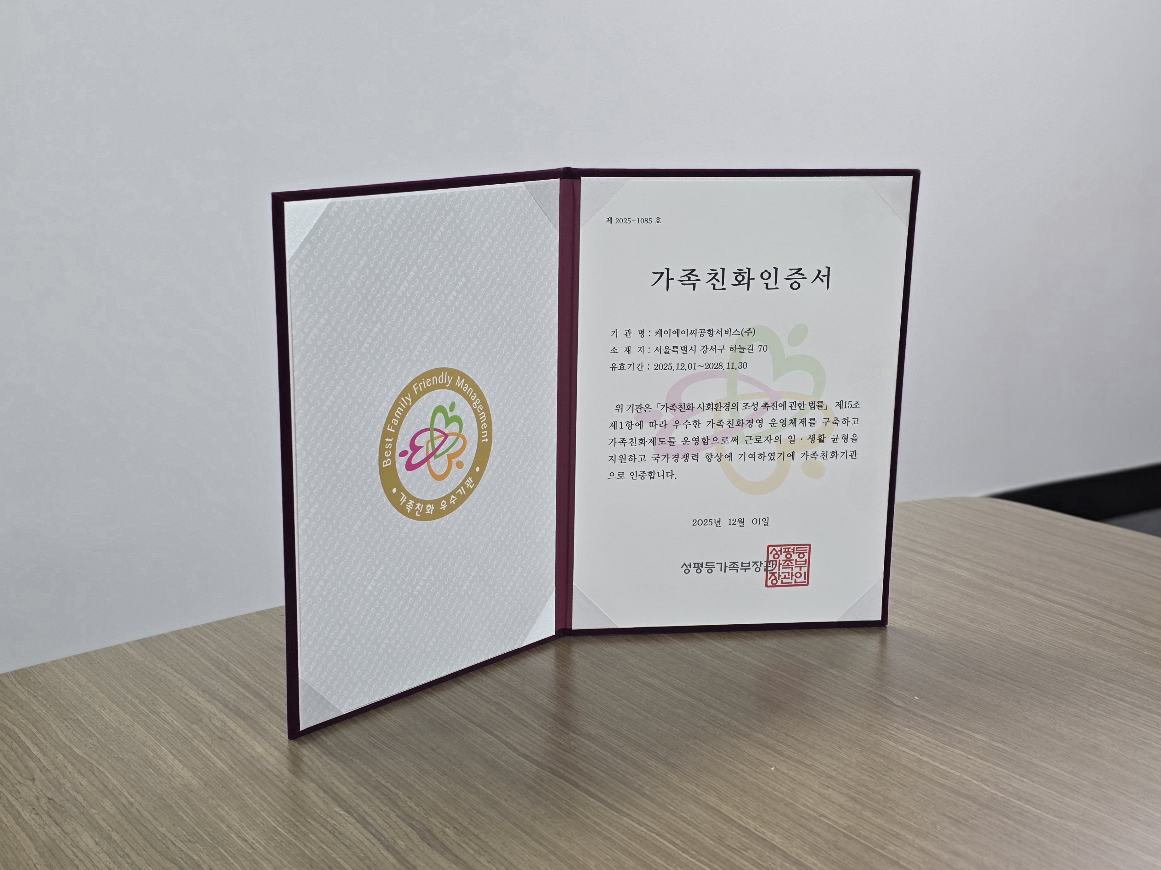KAC공항서비스(주)가 12월 1일 자로, 성평등가족부가 주관하는 ‘가족친화 인증’을 성공적으로 취득했다.